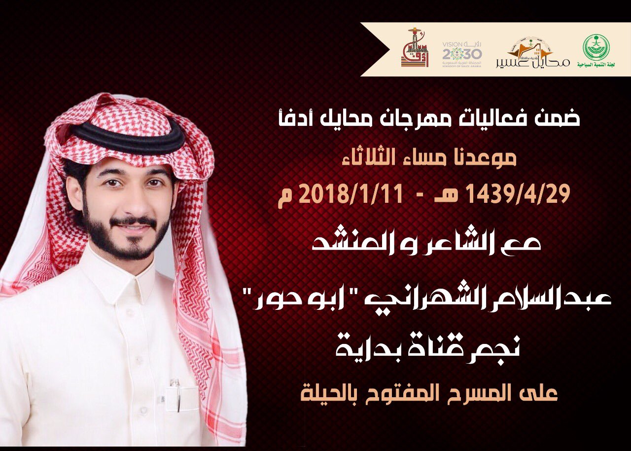 محايل نيوز En Twitter مهرجان محايل ادفا١٤٣٩ مساء الثلاثاء الشاعر والمنشد عبدالسلام الشهراني ابو حور نجم قناة بداية وبرنامج زد رصيدك ابوحور في مهرجان محايل Https T Co 0p7mpbegkp