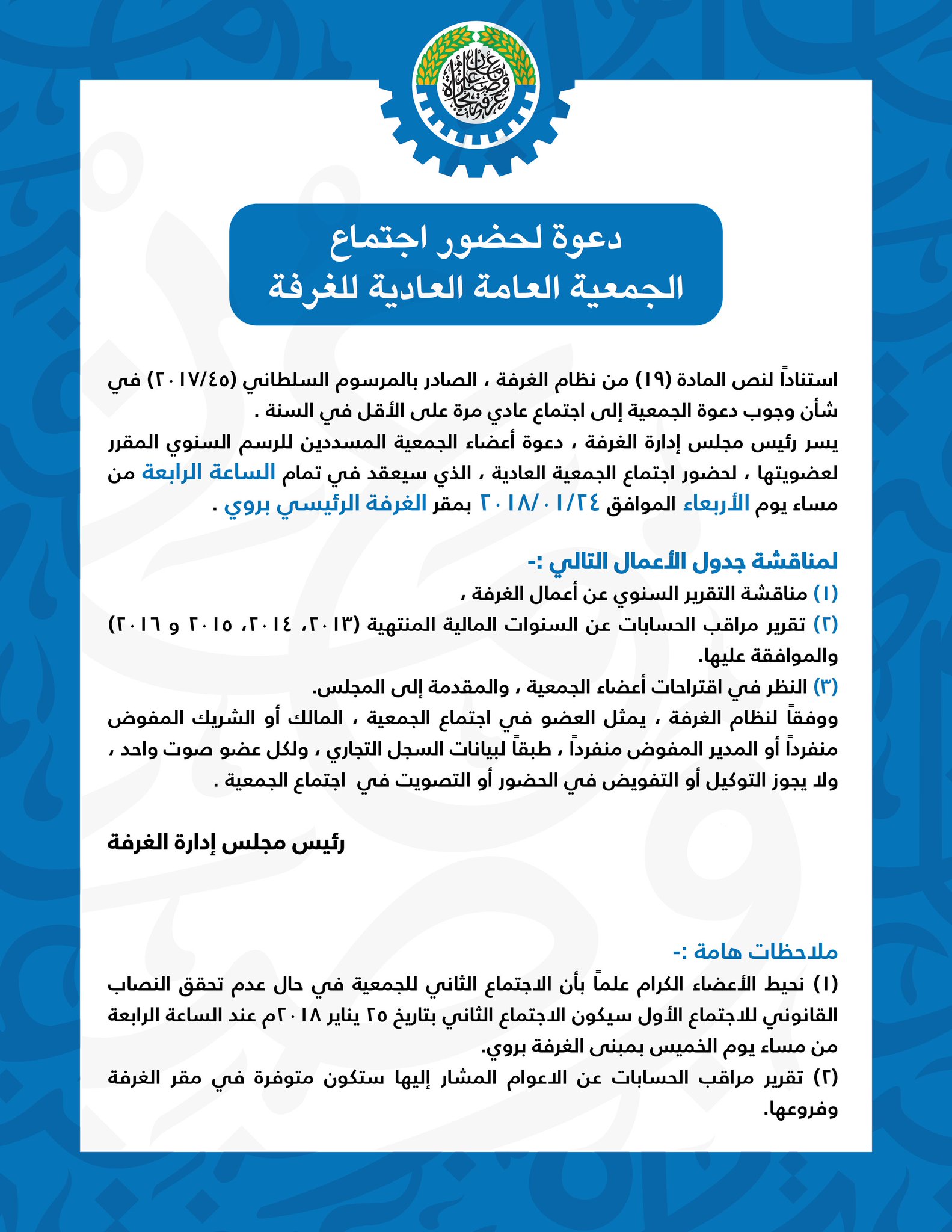 غرفة تجارة وصناعة ع مان Twitterissa يسر الغرفة دعوة أصحاب وصاحبات الأعمال من مختلف محافظات السلطنة لحضور اجتماع الجمعية العمومية للغرفة والتي ستعقد يوم الأربعاء 24 يناير 2018 4 00 مساء مقر الغرفة الرئيسي في