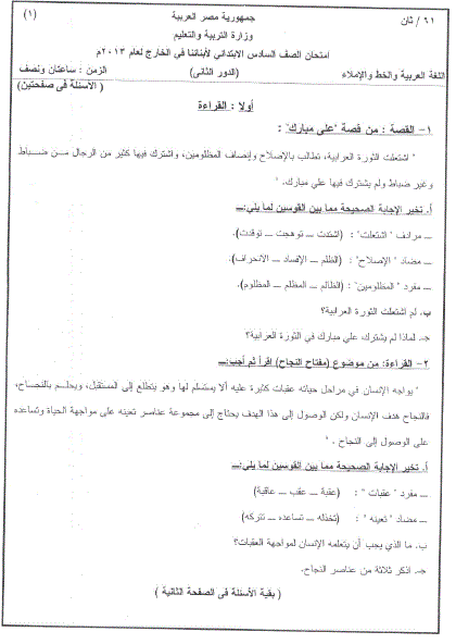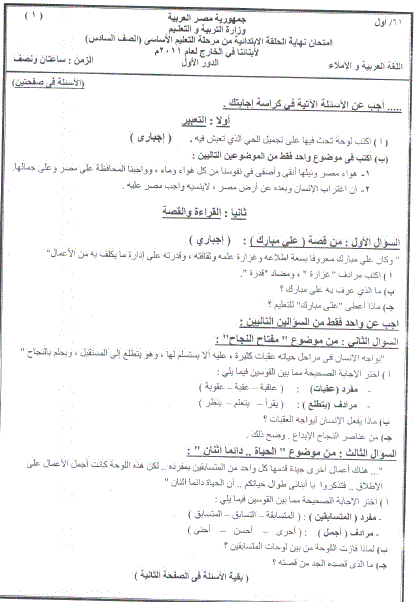 Adz4u Omniawagdy نشر اختبارات اللغة العربية للصف السادس الابتدائى أبناؤنا فى الخارج الدور الأول والثانى للأعوام السابقة