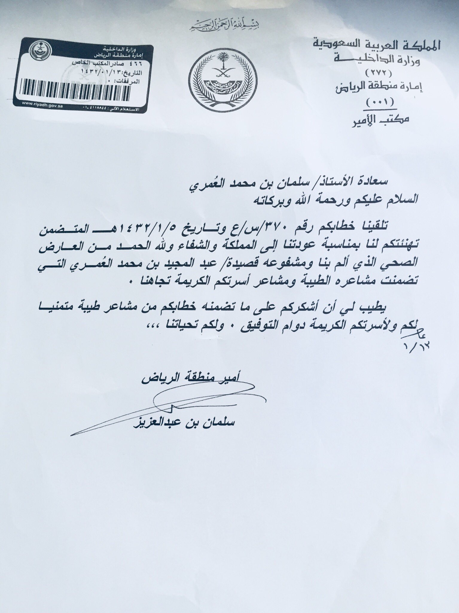 عبدالمجيد الع مري على تويتر رسالة شكر من خادم الحرمين الشريفين الملك سلمان بن عبدالعزيز حفظه الله قبل تسعة أعوام موجهة لأخي الأستاذ سلمان العمري وللأسرة العمرية ردا على الرسالة المرفوعة للمقام الكريم المتضمنة قصيدة التهنئة